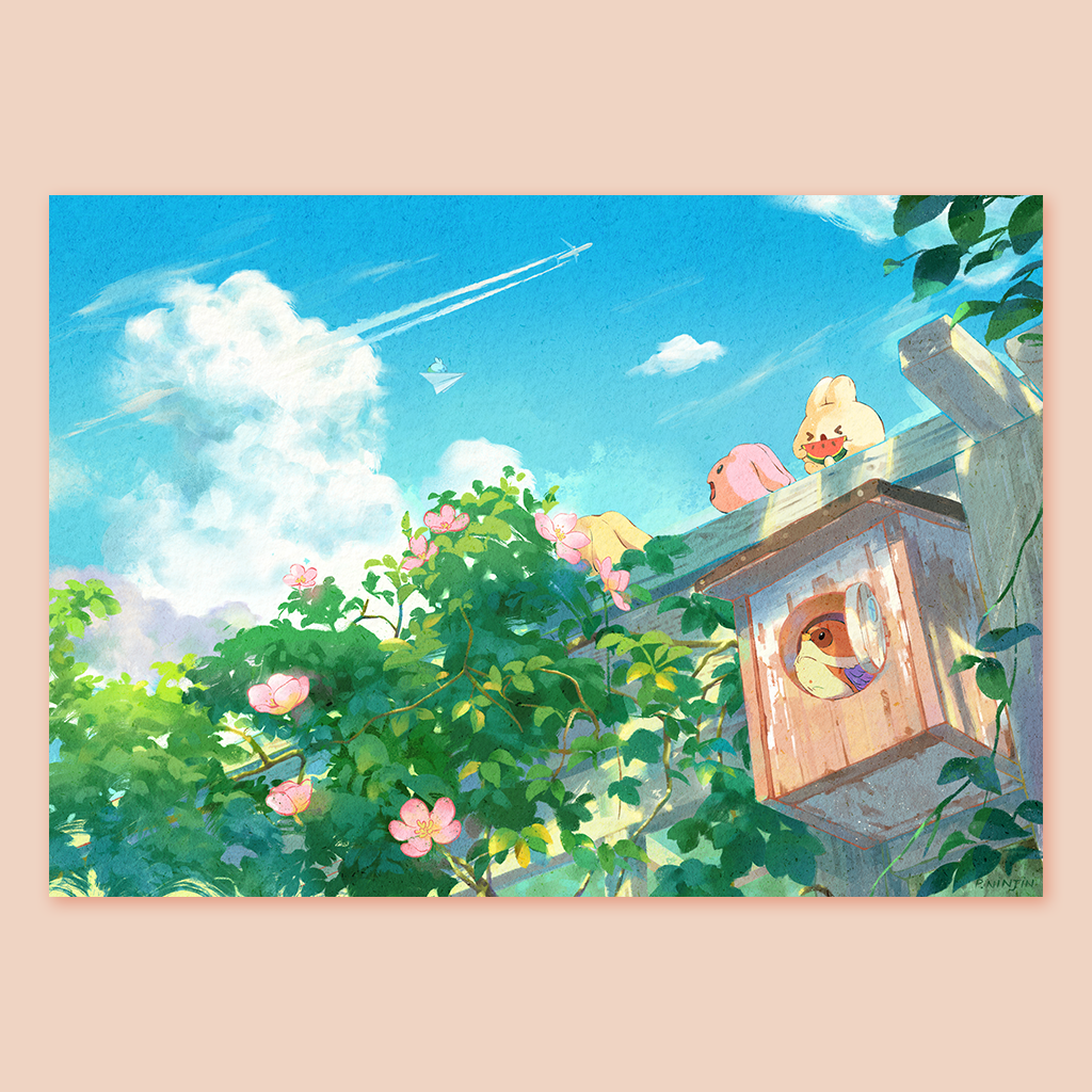 This painting marks a milestone in my life, symbolizing the transition between two chapters. The bunny leaves the workplace, hops on her paper plane, and starts her new journey, saying goodbye to everyone behind. The giant bunny represents my previous workplace, which gave me the big boost that allows me to finally "fly high". 🛫🐇☁️💙✨