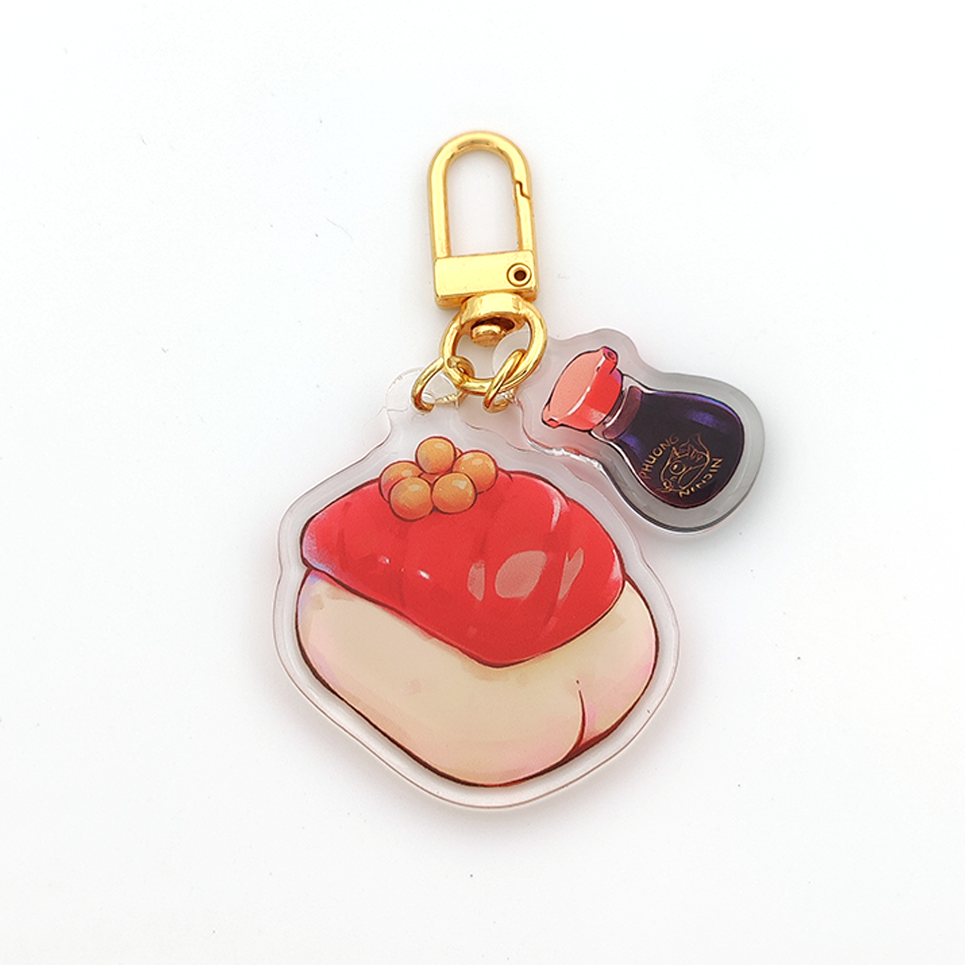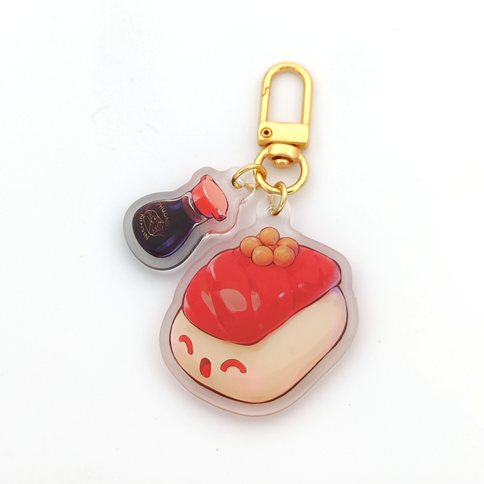 A sushi themed keychain with cat ears and small soya bottle! The back side reveals a sneaky butt! Cute and quirky.